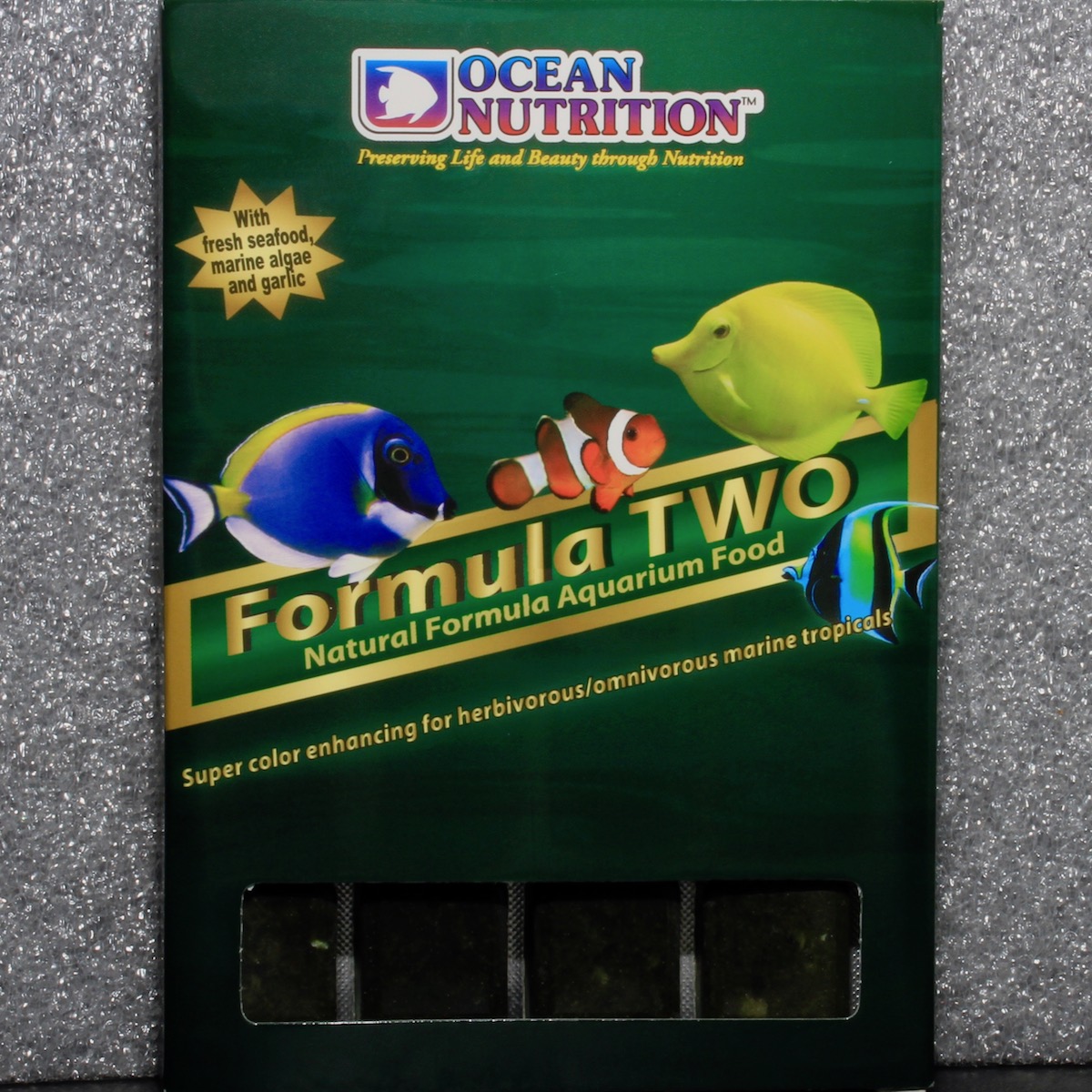 Innehåller vitlök, färska fiskfiléer, marina räkor, tång, havsallat, musslor, spirulina, vitaminer, … Förbättrar färg och hjälper till att upprätthålla hälsa och vitalitet. Utvecklad av akvakulturbiologer för att kopiera den naturliga kosten. Idealisk i kombination med Ocean Nutrition Formula Two Marine Pellets och Flakes.