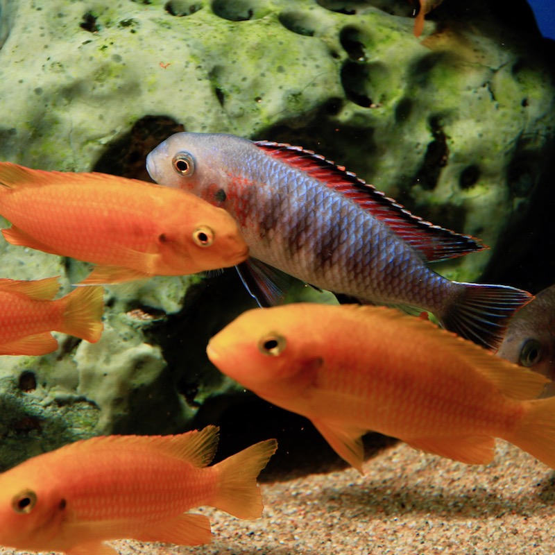 En så kallad ”mbuna” som betar alger och hålls bäst i större grupper.